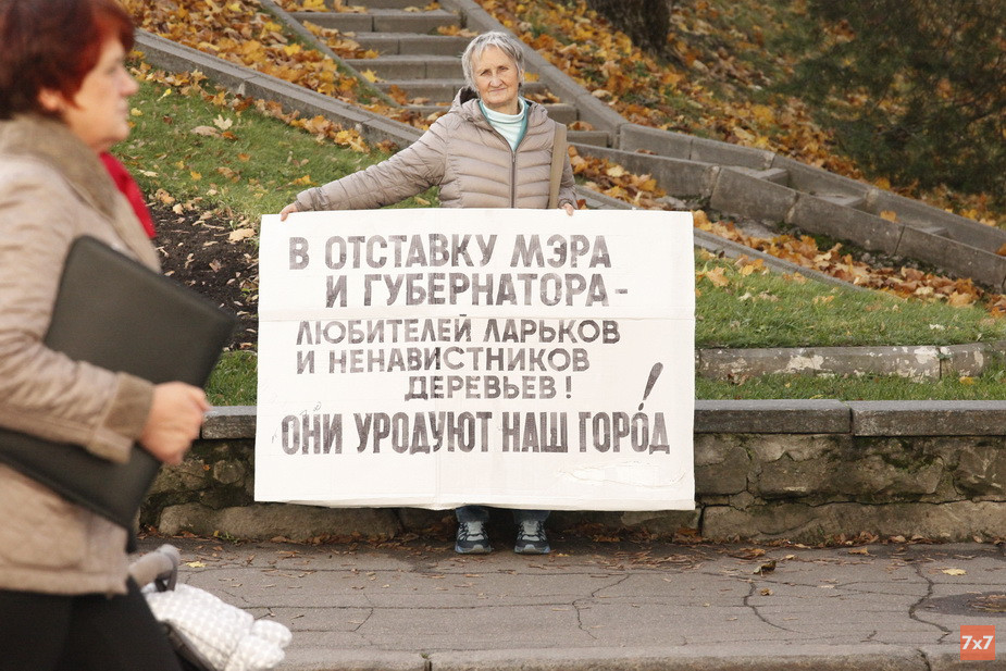 69-летняя гражданская активистка Татьяна Пришанова вышла с одиночным пикетом к зданию администрации Смоленска с плакатом «В отставку мэра и губернатора — любителей ларьков и ненавистников деревьев! Они уродуют наш город!». Об этом 14 октября сообщил корреспондент «7х7».