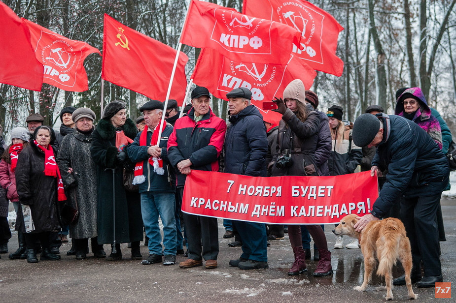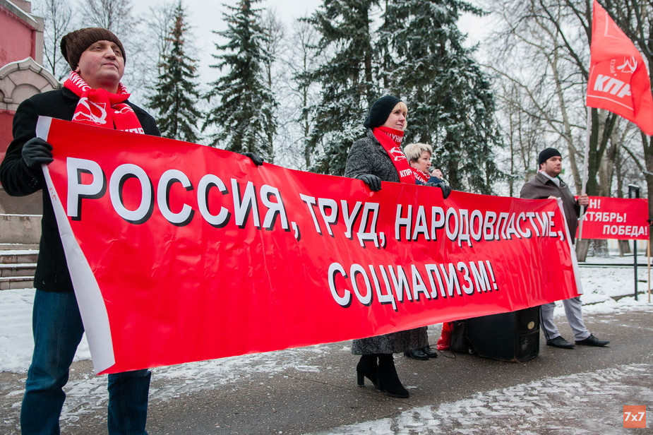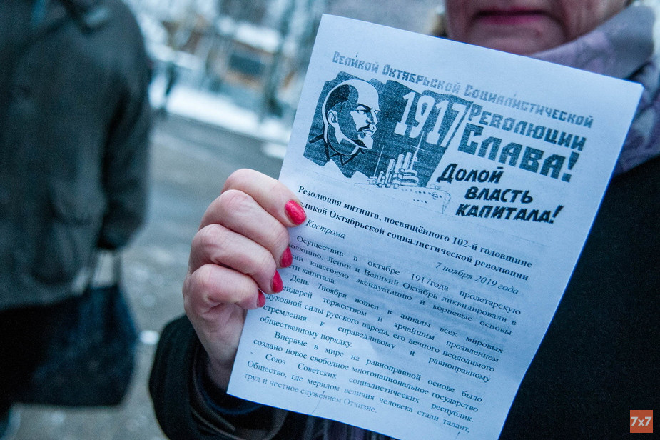 На митинге в честь 102-й годовщины событий октября 1917 года костромские коммунисты и присоединившиеся к ним представители левых движений рассказали о хищнической сущности капитализма и современных политических репрессиях, призвали участвовать в выборах и восстановить государственный праздник 7 ноября, сообщил корреспондент «7х7».
