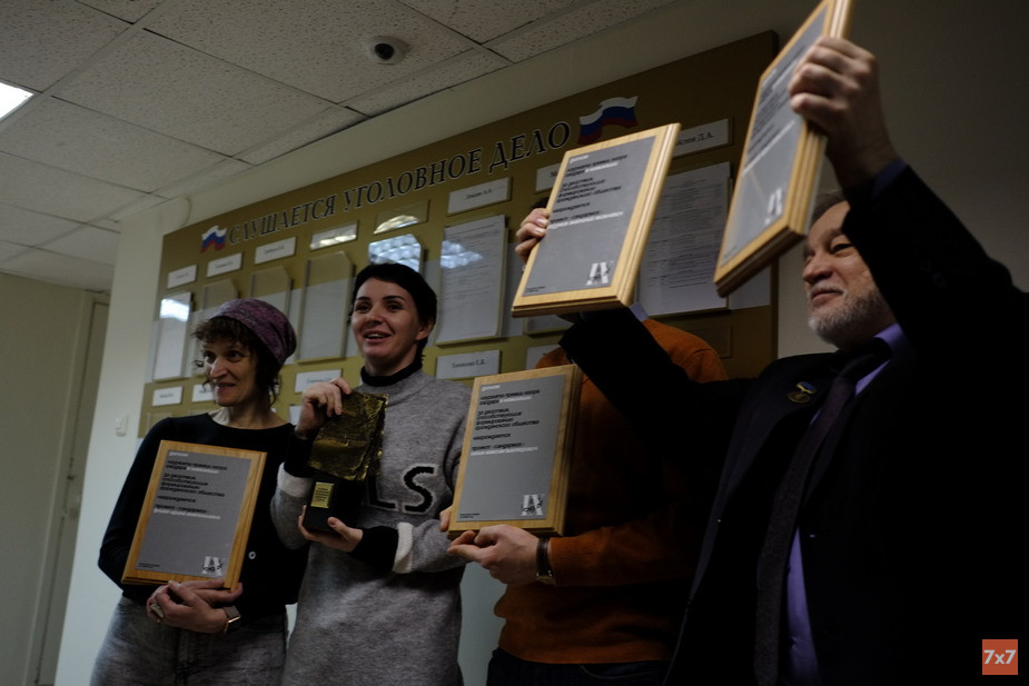 В Петрозаводском горсуде группа поддержки члена карельского общества "Мемориал" Юрия Дмитриева встретила его с наградами. Дмитриев получил премию имени Егора Гайдара за исследование захоронений жертв репрессий на урочище Сандармох. об этом 26 ноября сообщил корреспондент "7х7" с судебного заседания.