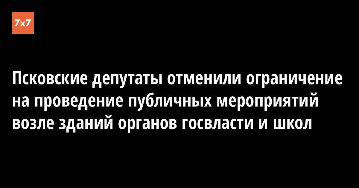 Депутаты Псковского областного Собрания приняли закон, который устраняет действующий ранее запрет на проведение митингов, шествий и демонстраций ближе 100 метров к зданиям органов государственной власти, консульств иностранных государств и образовательных учреждений. Об этом сообщила 28 ноября газета «Псковская губерния».