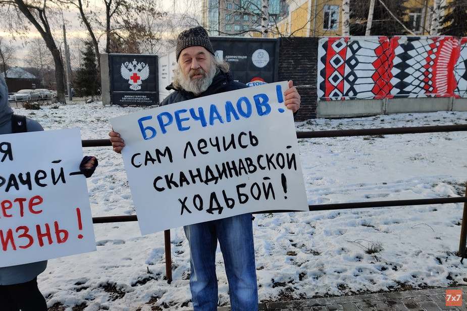 Протестующие держали плакаты : «Нет концессии онкодиспансера», «Бречалов, лечись сам скандинавской ходьбой!», «Оптимизация медицины – геноцид народа», «Сокращая врачей – сокращаете жизнь», «Сборы на лечение больных детей через СМС – позор государству» и другие.