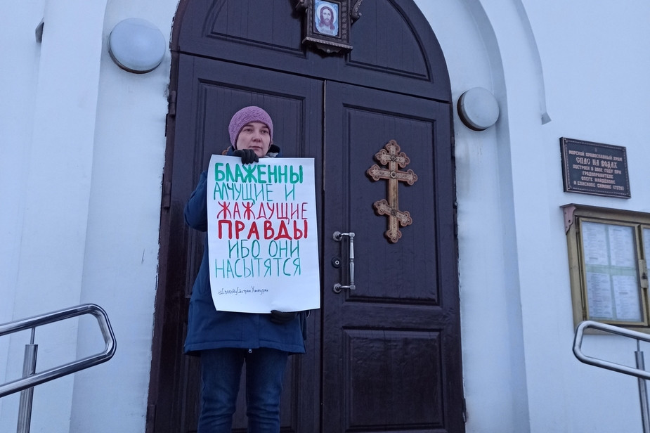Four members of the regional Kostyor (‘Bonfire’) feminist group came out with posters to the sea Orthodox Church of the Savior on the Waters in support of Khachaturian sisters, who are on trial for the murder of their father who tortured them, and for the adoption of a law on the prevention of domestic violence. They called the action «Bridge of Sisters». The young women spent two hours in the street: they stood with thematic posters and handed out solidarity ribbons with the inscription #свободусестрамхачатурян (‘Freedom to Khachaturian Sisters’) to passers-by.