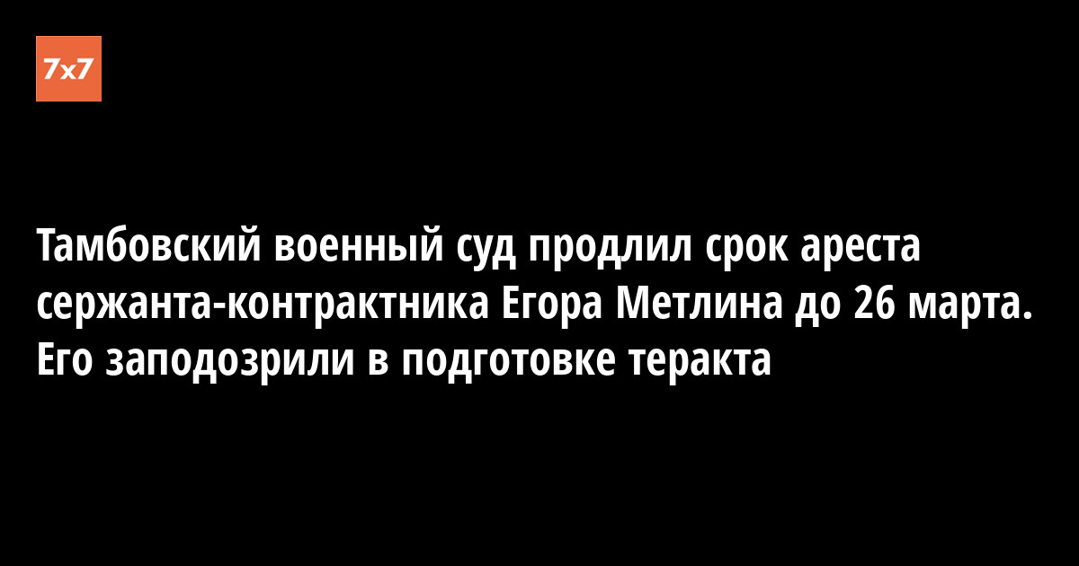 Тамбовский гарнизонный военный суд, рассматривающий дело о возможной подготовке теракта против цыган и государственных учреждений, продлил срок ареста подозреваемому по этому делу сержанту-контрактнику Егору Метлину до 26 марта. Об этом «7х7» сообщила 22 января его адвокат Оксана Маркеева.