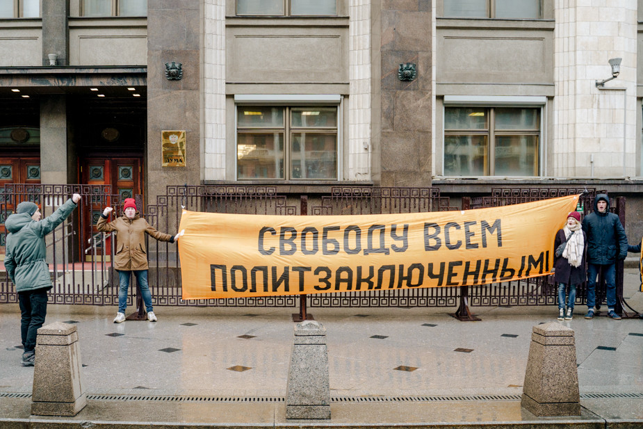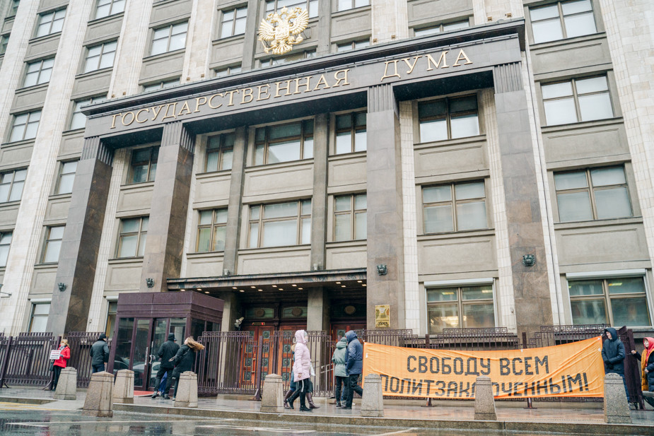 Сотрудники ФСО задержали восьмерых активистов с баннером «Свободу всем политзаключенным!» у здания Госдумы. Об этом «7х7» сообщил 3 февраля пресс-секретарь «Открытой России» Константин Фомин.