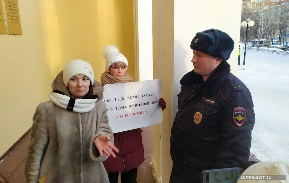 About 15 police officers were standing near the theater building, and three members of the National Guard were at the entrance. Not everyone was allowed inside the theater: two women (delegates) of the Congress asked for passports and checked with lists. Only Komi Voityr delegates and invitees were allowed in. The organizers explained this by the fact that the hall could hold only 400 people.
