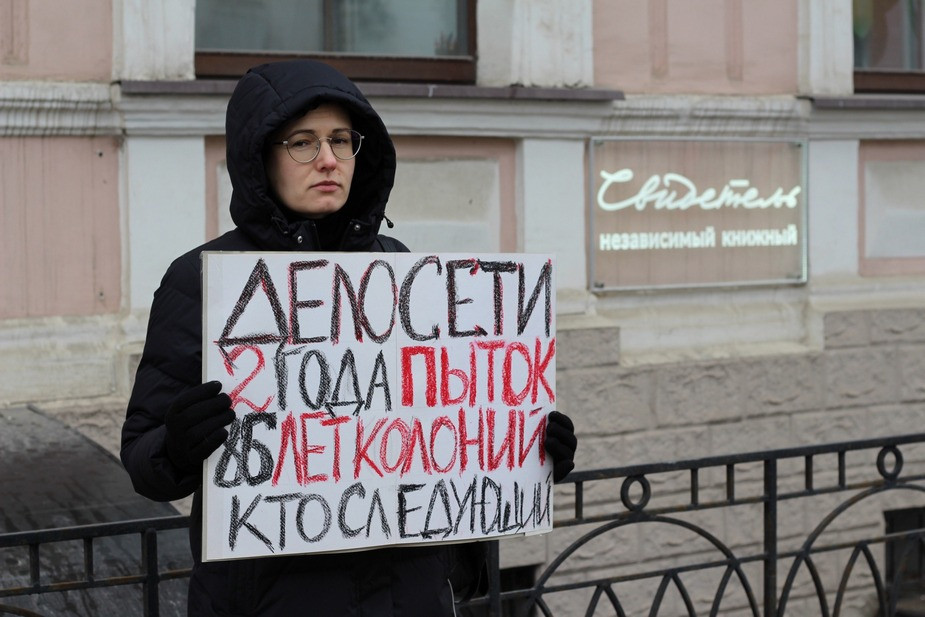 Владелец книжного магазина «Свидетель» Ирина Рочева на один день приостановила работу в знак солидарности с фигурантами дела «Сети»* вместе с рядом других книжных магазинов в Санкт-Петербурге и Москве. 17 февраля она вышла на одиночный пикет.