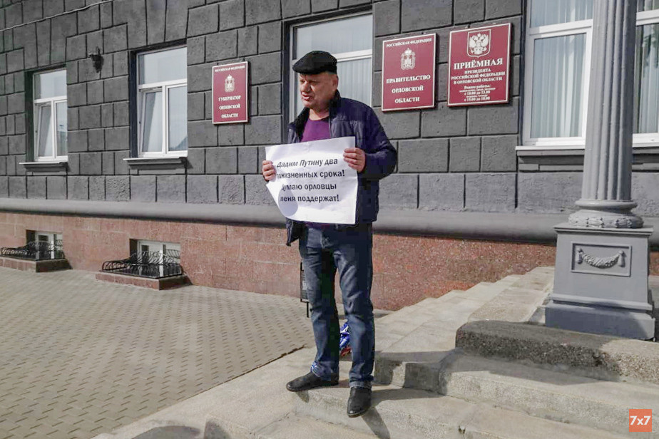 Орловский активист Вадим Невров 19 марта пикетировал здание администрации Орловской области с призывом "Дадим Путину два пожизненных срока". Корреспондент "7х7" поговорил с пикетчиком.