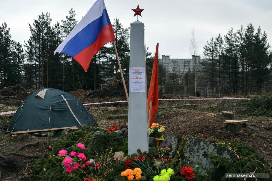 The memorial sign to Yasha Stepanov, the defender of Petrozavodsk, was installed in the Kamenny Bor Park at the soldier’s death site (he was shot by a sniper in October 1941) in the early 1990s. The builders dismantled the monument during the forest clearing on the construction site of a kindergarten, the Kamenny Bor Park’s defenders installed a new memorial sign on their own after that.