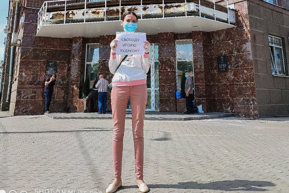 Анастасия Косарева рассказала «7x7», что ее, видимо, задержали за нарушение режима самоизоляции. В Вологодской области он действует до 1 июля. Девушка стояла с плакатом «Свободу Игорю Худякову» в перчатках и маске. По ее словам, к самому пикету у полицейских претензий не было.