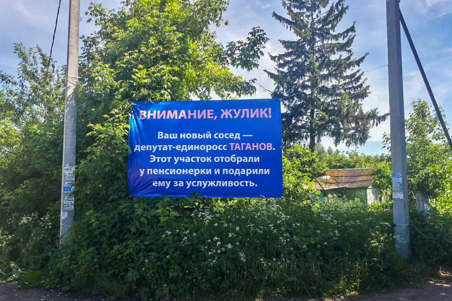На земельном участке, выданном депутату муниципалитета (гордумы) Ярославля Алексею Таганову как многодетному отцу, появился баннер с обвинениями в жульничестве. Об этом в своих соцсетях сообщил ярославский штаб Алексея Навального.