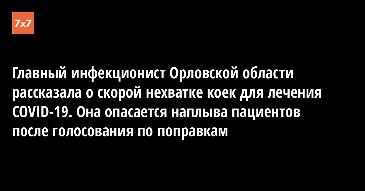 Главный внештатный инфекционист Орловской области Виктория Адоньева заявила, что опасается нехватки мест для пациентов с COVID-19 после голосования по поправкам в Конституцию. Об этом она рассказала изданию «Орловские новости» в интервью, которое было опубликовано 18 июня.