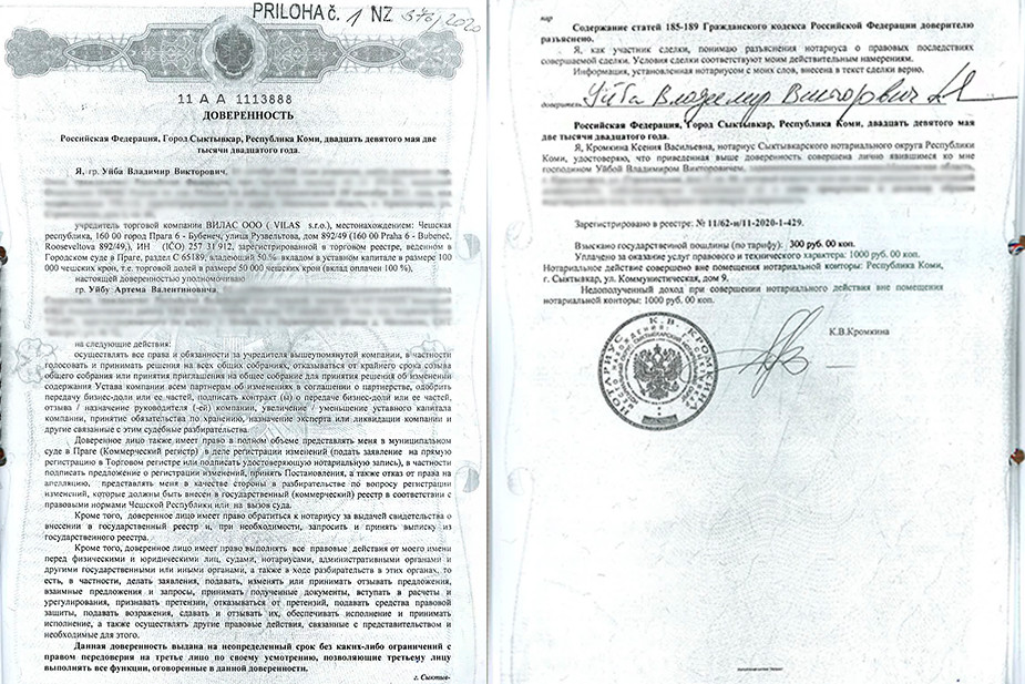 Ранее Уйба на официальный запрос «7x7» отвечал, что не владеет иностранными активами и, в частности, компанией Vilas. Из документов следует, что 29 мая, на следующий день после выхода материала «7х7», он оформил доверенность у сыктывкарского нотариуса Ксении Кромкиной, в которой указал себя как учредителя этой чешской компании. Этот документ дает Артёму Уйбе право совершать сделки компании и представлять ее интересы в чешских государственных органах.
