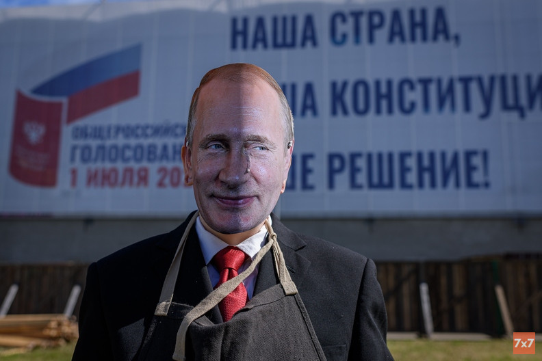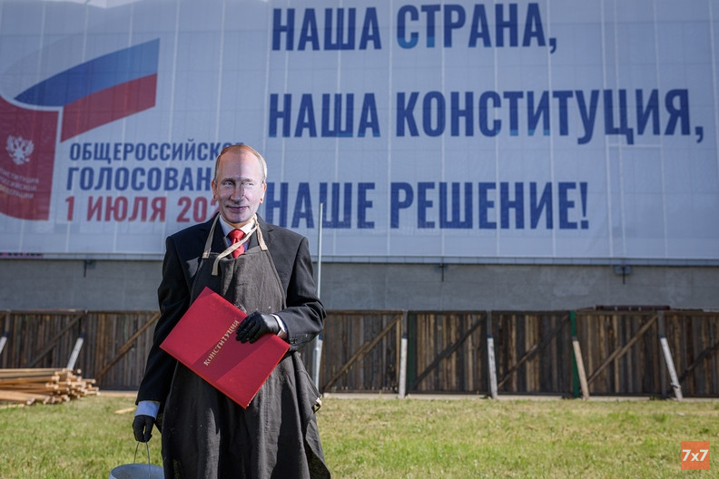 В центре Сыктывкара активисты 28 июня устроили перформанс по поправкам в Конституцию РФ. Человек в маске Путина белой смесью испачкал папку, которая изображала главный документ страны. На акции присутствовал корреспондент «7x7».