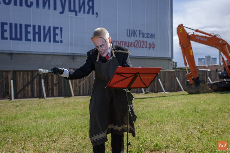 Акцию жители провели на площади около Центрального бассейна, на котором висит большой баннер с рекламой голосования по поправкам в Конституцию. Человек в маске президента России Владимира Путина принес папку с надписью «Конституция» и ведро с белой смесью. Надев черный халат, он достал кисть и сделал несколько неаккуратных мазков, после чего закрыл папку и ушел.