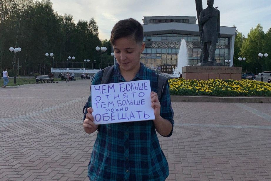 Со 2 июля жители Сыктывкара ежедневно выходят на одиночные пикеты в центре города, протестуя против итогов голосования по поправкам к Конституции. На некоторых протестующих полиция уже составила по несколько протоколов за нарушение порядка проведения пикетирования, но это не останавливает активистов. Об этом «7х7» сообщила одна из участников протестной акции Нина Попугаева.