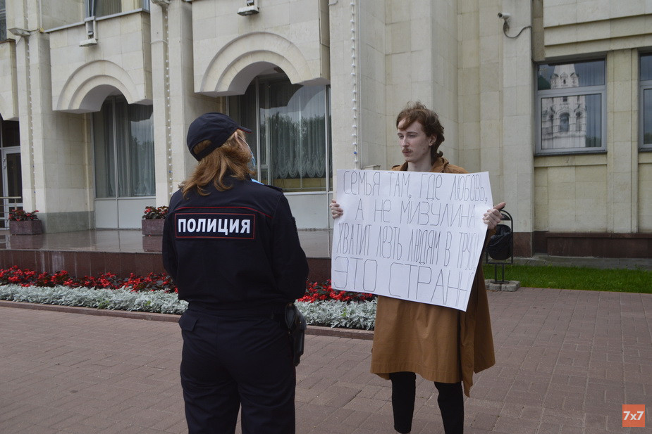 Через полчаса Сироткин перешел в другую часть улицы Кирова, затем - на Советскую площадь, где со своим пикетом уже стоял другой активист, Тимофей Данилов. Он вышел к зданию правительства Ярославской области с плакатом «Семья там, где любовь, а не Мизулина. Хватит лезть людям в трусы. Это странно».