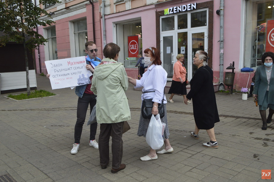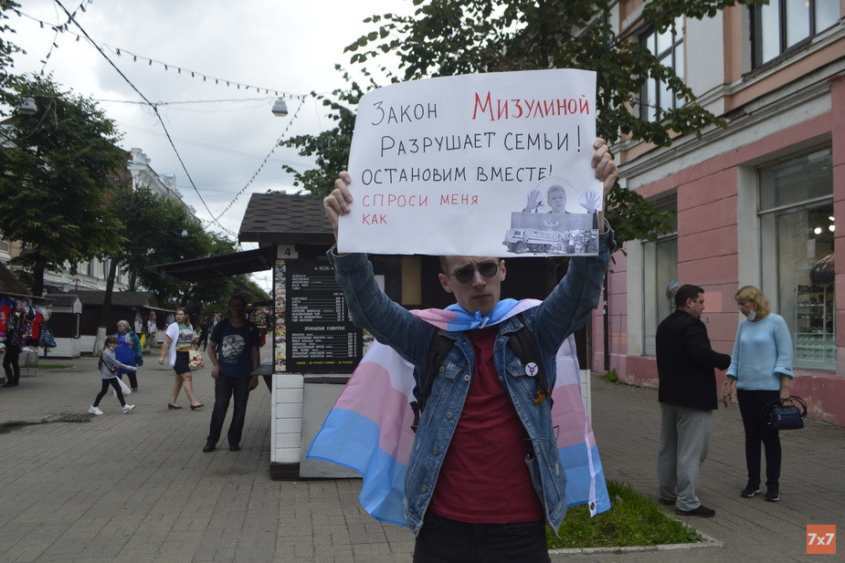 Активист Ярослав Сироткин начал свой пикет в 14 часов на улице Кирова. Он завернулся в трансгендерный флаг, а в руках держал плакаты «Нет мизулинскому фашизму» и «Закон Мизулиной разрушает семьи! Остановим вместе. Спроси меня как». Всем заинтересованным прохожим Ярослав объяснял суть нового закона и предлагал подписать петицию против его принятия. Ссылку на петицию он разместил на листовках. Многие прохожие поддерживали его пикет и брали листовки.