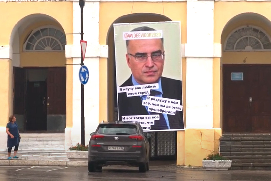 Неизвестный вывесил на фасаде Дома детского творчества напротив мэрии Касимова Рязанской области баннер с портретом главы города Игоря Авдеева. Видео акции появилось на YouTube 30 июля. Изображение чиновника сопровождается высказыванием неизвестного автора: «Я научу вас любить свой город. Я разрушу в нем все, чем вы до этого пренебрегали. И вот тогда вы все поймете, что потеряли». Баннер провисел около получаса.