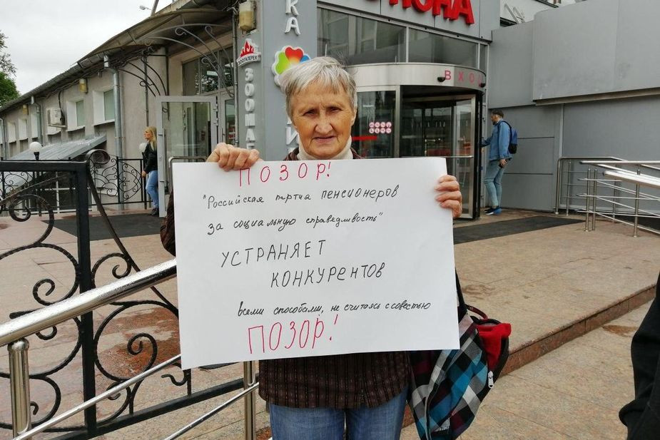 Татьяна Пришанова 1 августа вышла к зданиям городской и региональной администраций и к ТЦ «Юнона» на площади Победы с плакатом «Позор! „Российская партия пенсионеров за социальную справедливость“ устраняет конкурентов всеми способами, не считаясь с совестью! Позор!».