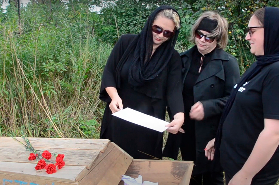 На видеозаписи три женщины в траурной одежде пишут маркерами невыполненные обещания кировских чиновников: строительство школы в микрорайоне Долгушино, предоставление мест в детских садах детям с трех лет по месту жительства, а в яслях — с полутора лет, обучение школьников в одну смену. Затем участницы акции сминают листы и кладут в гроб.