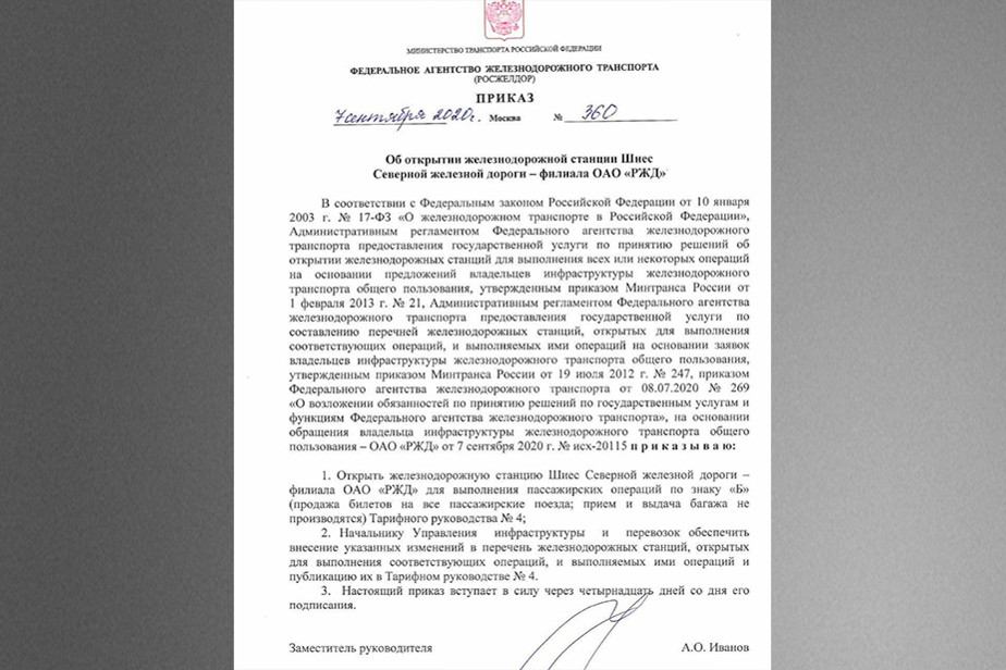 «Станцию на Шиесе откроют ровно через 14 дней. Соответствующий документ уже подписан руководством Росжелдора — приказ №360 от 7 сентября. Благодарен министру транспорта РФ Евгению Дитриху за максимально оперативное решение вопроса, о котором договаривались с жителями Ленского района на недавней встрече», — написал Цыбульский.
