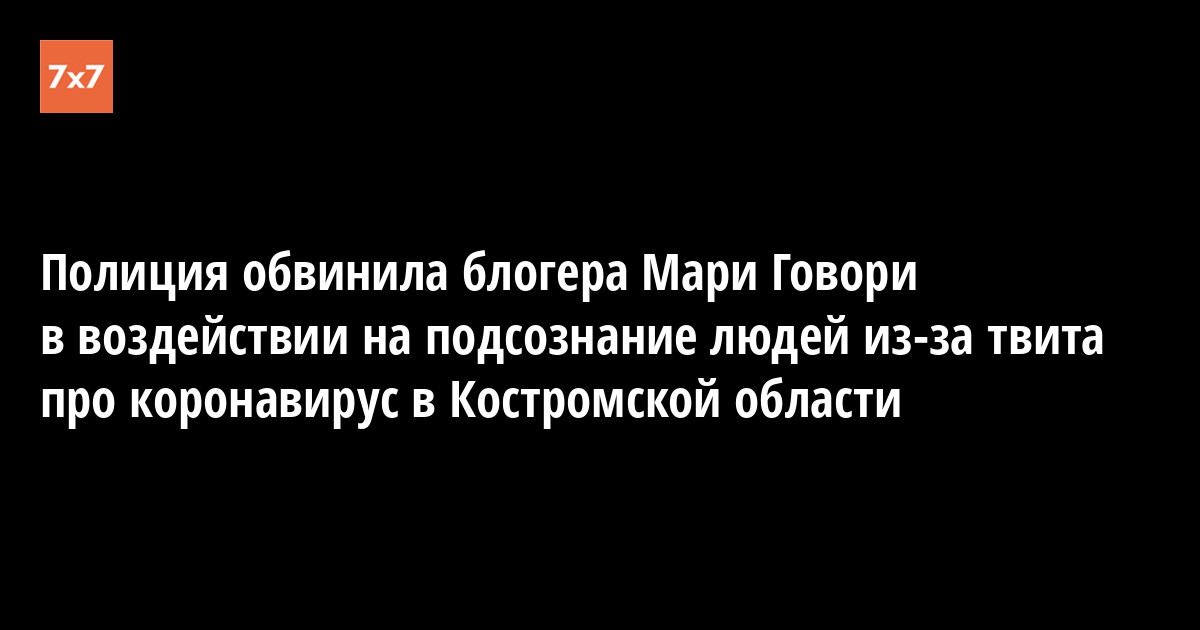 Блогер Мария Чистякова, известная под псевдонимом Мари Говори, опубликовала выдержку из протокола, который на нее составили полицейские после ее твита о коронавирусе в городе Шарье Костромской области. Ее обвиняют в злоупотреблении свободой массовой информации. Об этом Чистякова сообщила 23 сентября в своем профиле.
