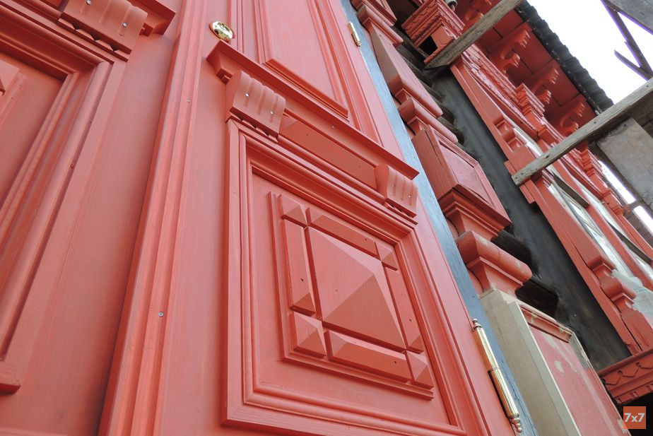 Точную копию исторической двери 100-летней давности изготовил из сосны местный столяр Борис Борисов. На работы ушло больше двух месяцев, фурнитуру для двери пришлось заказывать из Петербурга, а специальные ножи для повторения уникальных дверных элементов – из Кирова.