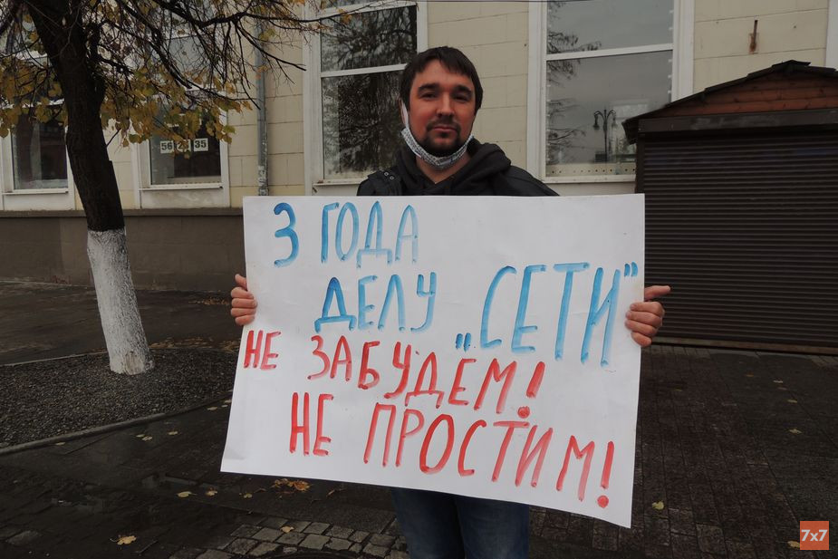 Иван Финогеев вышел на одиночный пикет на улицу Московскую неподалеку от здания УФСБ по Пензенской области. Он держал в руках плакат «Три года делу „Сети“*. Не забудем, не простим!».