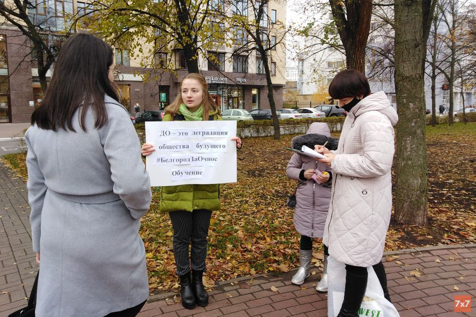 Одна из пикетчиц по имени Лариса, представившаяся участницей Общенародного союза возрождения России, вышла с плакатом «ДО – это деградация общества будущего. #Белгород ЗаОчное обучение». Она рассказала «7х7», что дети из-за отсутствия контакта с учителями не получают качественного образования, а из-за редких встреч со сверстниками не смогут потом полноценно общаться с людьми, не смогут социализироваться.