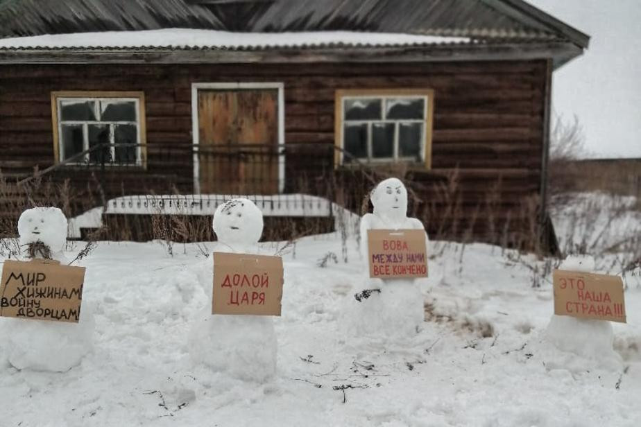 In Arkhangelsk Oblast, police detained activist of the Pomorye is not a Dump! Movement Elena Kalinina. She built several snowmen with posters "Down with the tsar", "This is our country", and "Vova, it is all over between us" near her house in the village of Zachachye. Elena Kalinina told the correspondent of 7x7 about it.