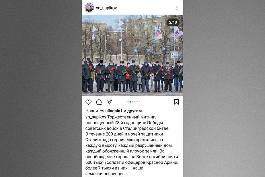 В Пензе чиновники, депутаты и представители «Молодой Гвардии „Единой России“» провели митинг ко Дню разгрома немецких войск под Сталинградом 2 февраля. При этом один из его участников, спикер гордумы Владимир Мутовкин, сам накануне отменил эту акцию из-за коронавируса.