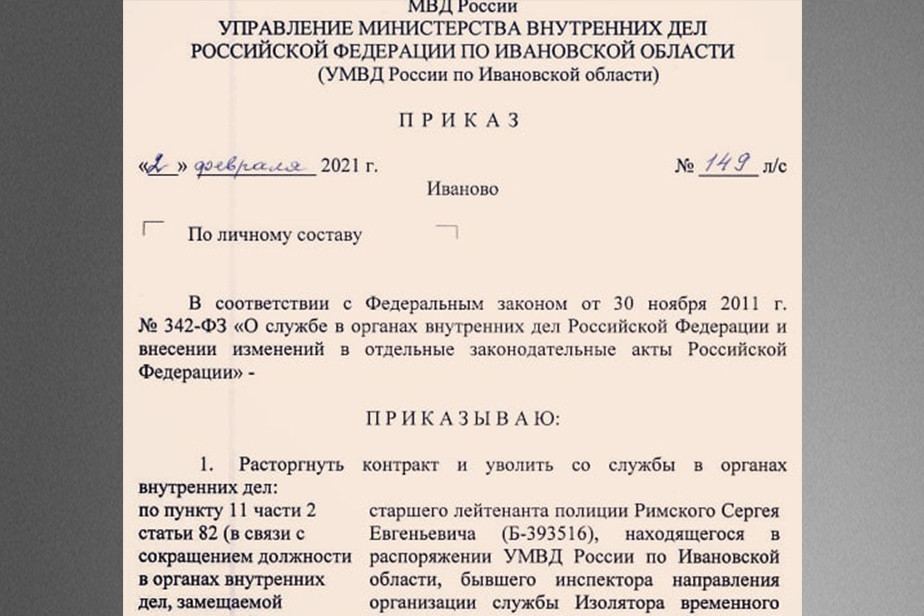 Полицейский из Иванова Сергей Римский написал заявление об увольнении из органов внутренних дел после решения Симоновского суда Москвы о замене Алексею Навальному условного срока на реальный. В видео, которое полицейский опубликовал в соцсетях 2 февраля, он говорит о том, что вынужден покинуть службу из-за сложившейся политической ситуации в стране. Приказ об увольнении опубликовало издание IvanovoNews.