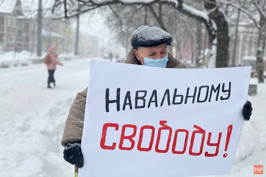 В Петрозаводске 3 февраля местный активист Александр Селюцкий вышел на одиночный пикет с плакатом «Навальному Свободу!».