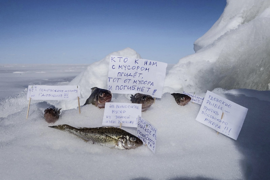 На снимке пять рыб лежат в снегу на льду озера с плакатами «Нет псковскому мусору на Гдовщине», «Кто к нам с мусором придет, тот от мусора и погибнет», «Не выносите мусор из вашей избы в нашу», «Защитим Чудское озеро от псковского мусора».