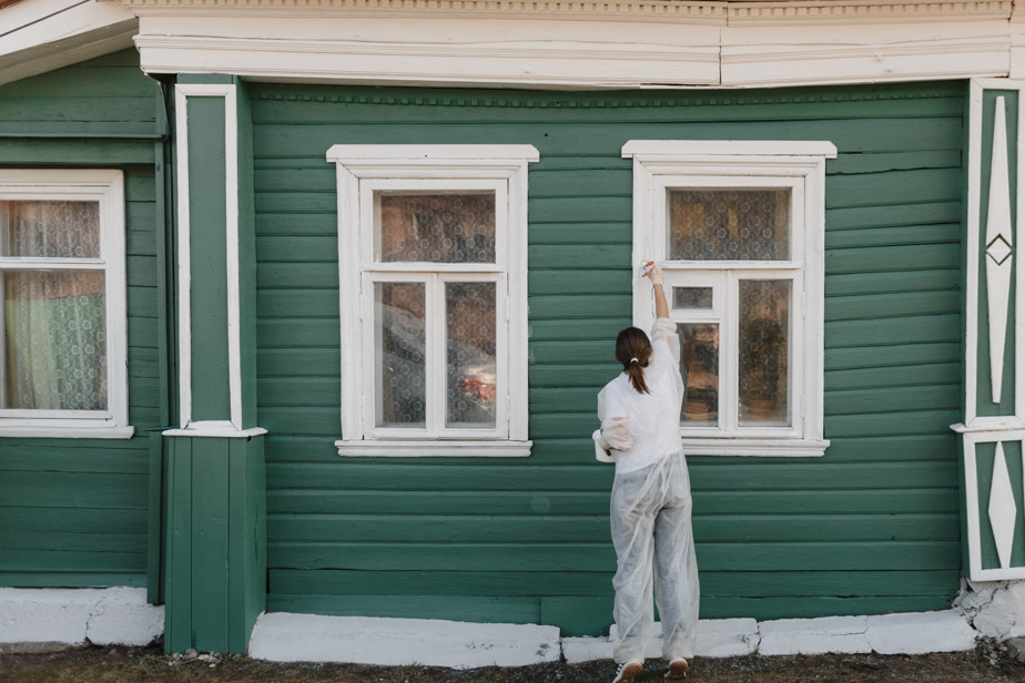 Волонтер красит окна дома №34 на улице Ростовской. Фото Анны Бородиной