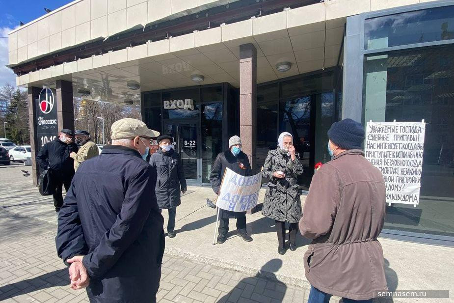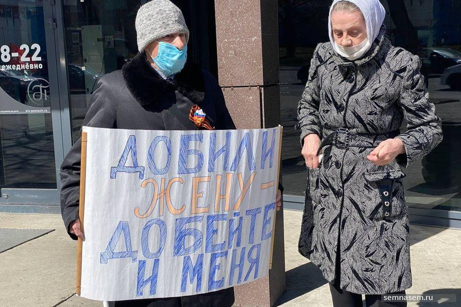 Veteran of the Great Patriotic War Nikolai Bakinov, who went on hunger strikes and held one-person pickets, handed over medals for the 70th anniversary of the Victory together with another war veteran Vladimir Dmetsov, lost his wife, and had to move to a rented apartment because of the addition during the fight with it, was among the rally’s participants. He attended the rally with a poster saying, "You finished off my wife — you can finish me off."
