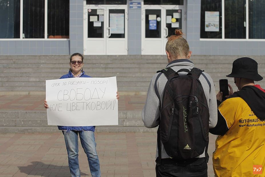 Одиночные пикеты в поддержку художницы Юлии Цветковой прошли на площадке перед кинотеатром «Современник». Мероприятие приурочили ко дню рождения художницы — 23 мая ей исполнилось 28 лет.