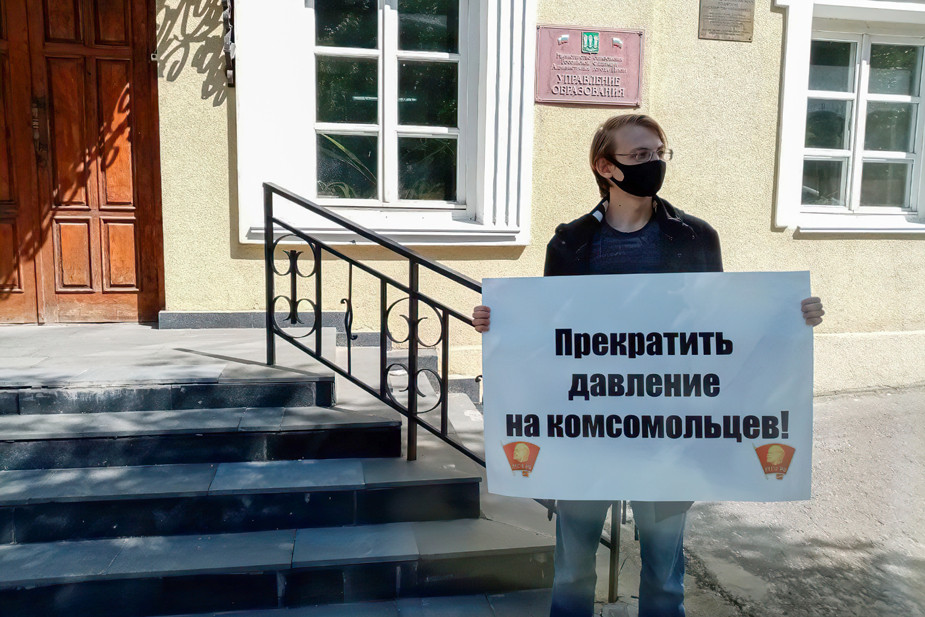 Депутат молодежного парламента при Заксобрании региона Валерий Гальцев провел пикет в поддержку ученика девятого класса школы №51, которого полицейские предупредили об уголовной ответственности за карикатуру на «Единую Россию» и Путина. Гальцев встал с плакатом «Прекратить давление на комсомольцев!» у входа в городское управление образования 9 июня.