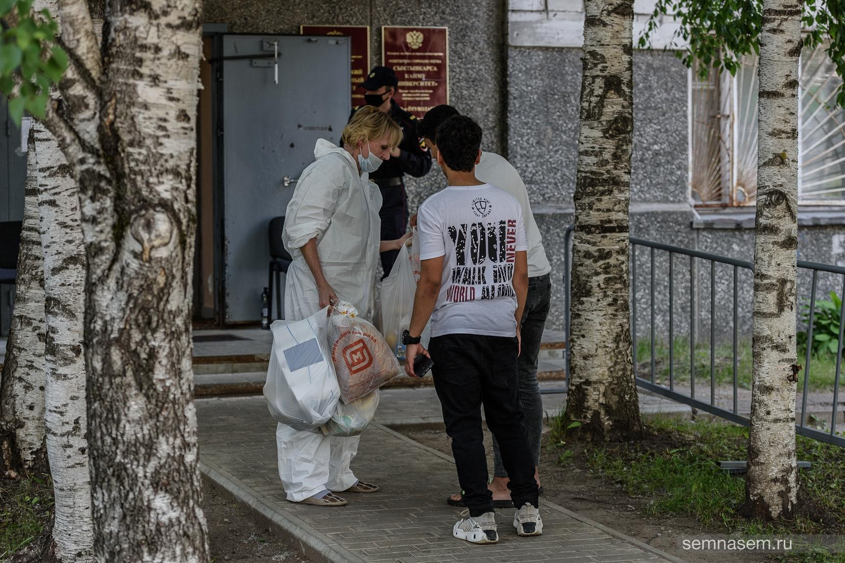 "It was said [in social networks] that the Young Guard brought water and food on June 17–18, but my friends were given neither water, nor food. Since today [June 21], they have organized hot meals: soup, second course, bread, and food for dinner. There is enough food for the whole day. But we are not provided with water, they only gave us small cartons of juice. It is forbidden to go buy food, but you can ask relatives or friends to send you food by a security guard's hand or call for delivery," the student said.