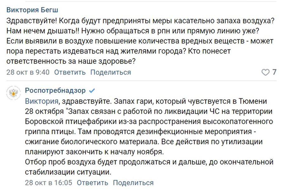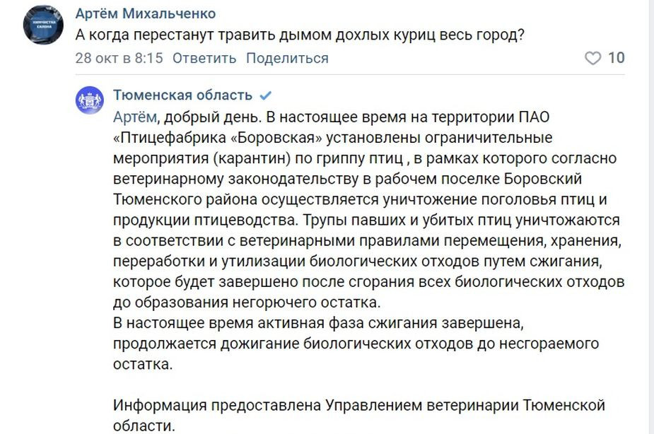 Власти Тюменской области 13 октября ввели карантин на Боровской птицефабрике, где обнаружили птичий грипп. Чтобы предотвратить распространение заболевания, кур начали сжигать. На протяжении двух недель тюменцы жаловались на неприятный запах гари, «который уже проник в каждую квартиру». 29 октября они опубликовали петицию на сайте Change.org и адресовали ее президенту Владимиру Путину.