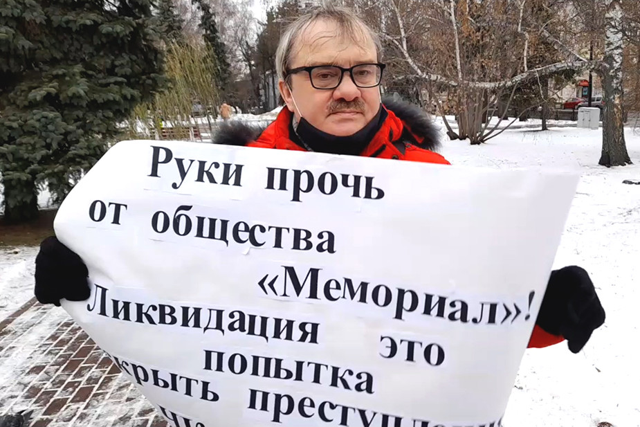 Игорь Топорков вышел в гайд-парк Ульяновска с плакатом «Руки прочь от общества „Мемориал“*! Ликвидация — это попытка преступления ЧК — КГБ». Мужчина отметил, что у него были репрессированные родственники, в том числе поэтому он решил высказаться в поддержку организации, которая занимается сохранением истории жертв репрессий.