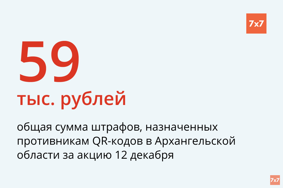 Архангельские полицейские задержали двух участников митинга против QR-кодов, который состоялся 12 декабря. Активистов Анну Шекалову и Александра Ларионова правоохранители доставили в отделения полиции, где составили протоколы о нарушении правил участия в публичном мероприятии. Шекалова и Ларионов — не единственные, кто подвергся административному преследованию в регионе. Интернет-журнал «7x7» посчитал, на какую сумму силовики оштрафовали архангельских противников QR-кодов за акцию 12 декабря.