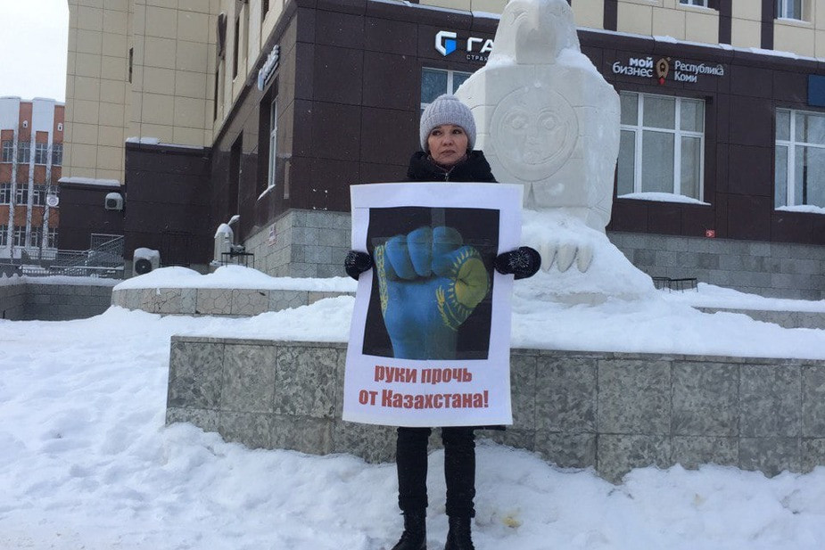 The action took place near the Peoples' Friendship House in Syktyvkar on January 9. The activist held a picket with a poster, "Hands off Kazakhstan". Elena Gulina said that the government of Kazakhstan should have independently solved the problems of its country. The activist does not want Russian citizens to die trying to solve another state's problems.