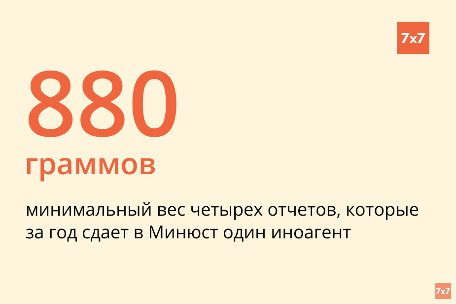 Как мы получили эту сумму: официальная форма отчета, которую установил Минюст для СМИ-иноагентов, содержит 44 листа. Мы взяли это число за минимум и умножили на четыре — столько отчетов ежегодно должен сдавать человек, попавший в реестр иностранных агентов. Полученную сумму умножили на вес одного листа бумаги А4. В среднем он составляет 5 г.
