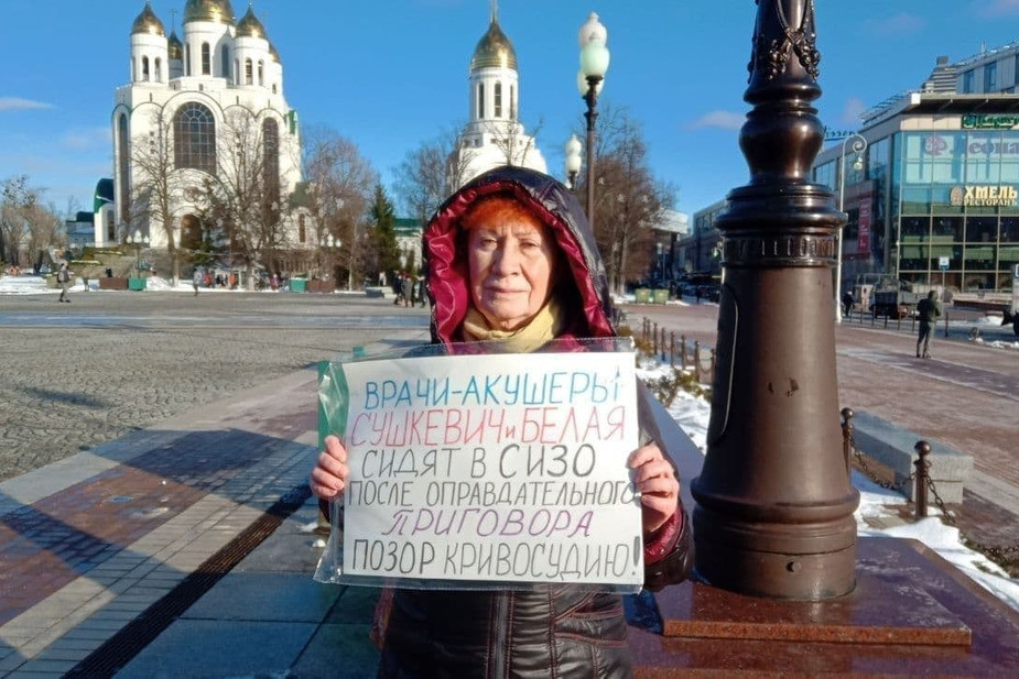 Активистка Людмила Зелинская вышла с плакатом «Позор кривосудию» в поддержку калининградских врачей Элины Сушкевич и Елены Белой. Их обвиняют в убийстве недоношенного младенца. Об этом сообщило издание «Север.Реалии»*.
