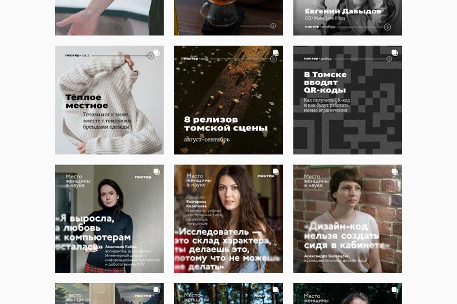Instagram-журнал «Постер», Томск. В 2019 году студент томского журфака Максим Ваганов решил сделать медиа, которое рассказывало бы о нетривиальных событиях, местах и людях города. Он собрал команду молодых авторов и дизайнеров и запустил Instagram-журнал «Постер». Проект не публикует типичных для региональных СМИ новостей: журналисты создают подборки локальных брендов, информационно поддерживают местные фестивали, помогают реализовывать идеи томских фотографов.