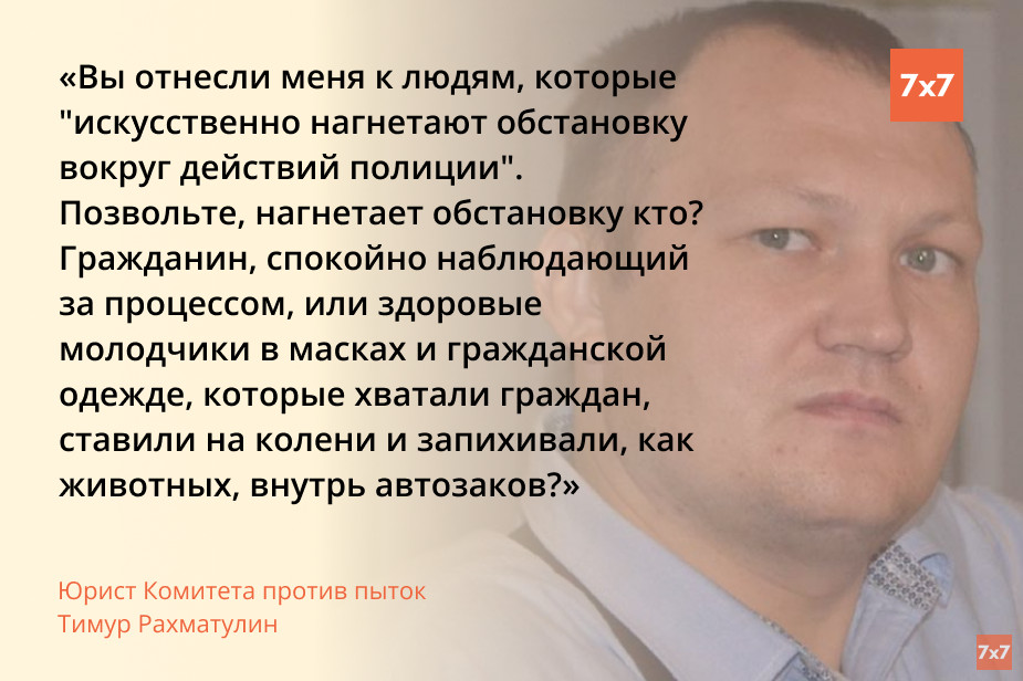 По словам юриста, на акции он был общественным наблюдателем за соблюдением прав граждан. Рахматулин отметил, что «никто из граждан не планирует быть задержанным на публичном митинге, когда выходит с собственным волеизъявлением, гарантированным Конституцией РФ». Он предложил Кампфу извиниться перед гражданами, «чьи права были нарушены».