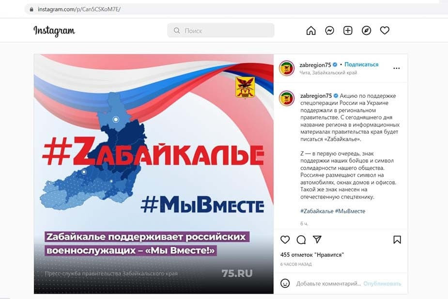 «Z — в первую очередь знак поддержки наших бойцов и символ солидарности нашего общества. Россияне размещают символ на автомобилях, окнах домов и офисов. Такой же знак нанесен на отечественную спецтехнику», — написала пресс-служба «Zабайкалья».