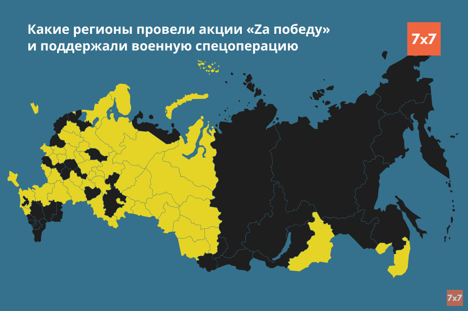 Владимир Путин объявил о начале «специальной военной операции» в Украине 24 февраля. После этого активисты стали выходить на пацифистские митинги и пикеты в своих родных регионах. Тем не менее многие города поддержали военную спецоперацию и стали проводить акции «Z» — устраивать автопробеги с российскими флагами, менять аватарки в соцсетях, вывешивать патриотические баннеры. Некоторые главы регионов даже официально изменили названия областей, республик и краев. Где поддержали Российскую армию — в одной картинке «7х7».
