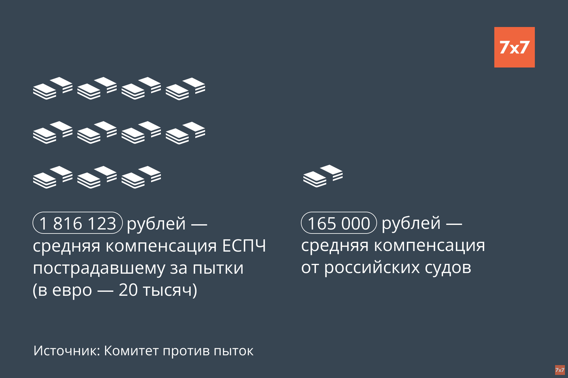 При этом компенсация пострадавшим от пыток, присуждаемая ЕСПЧ, в 10 раз больше, чем назначаемая сумма российскими судами. В среднем европейский суд оценивает компенсацию в 20 тыс. евро или 1,8 млн руб. (по курсу Центрального банка России за 17 февраля 2022 года). Самая большая сумма выплат на практике оренбургского отделения составляет 45 тыс. евро, самая маленькая — 13 тыс.